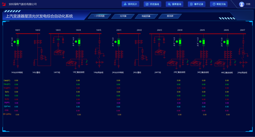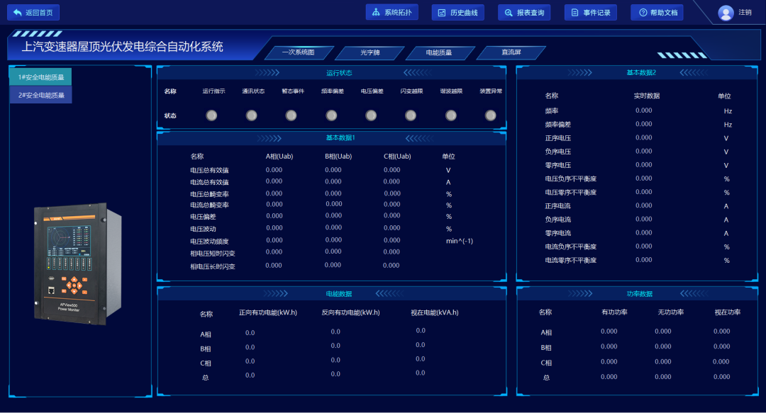 电能质量在线监测装置采集#1、2#光伏并网接入点的电能质量信息,可以对整个供电系统的电能质量包括稳态状态和暂态状态进行持续监测。系统界面实时显示装置通信状态、各监测点的A/B/C相电压总畸变率、三相电压不平衡度百分比和正序/负序/零序电压值、三相电流不平衡度百分比和正序/负序/零序电流值,帮助管理人员实时掌握供电系统电能质量情况,以便及时发现和消除供电不稳定因素。