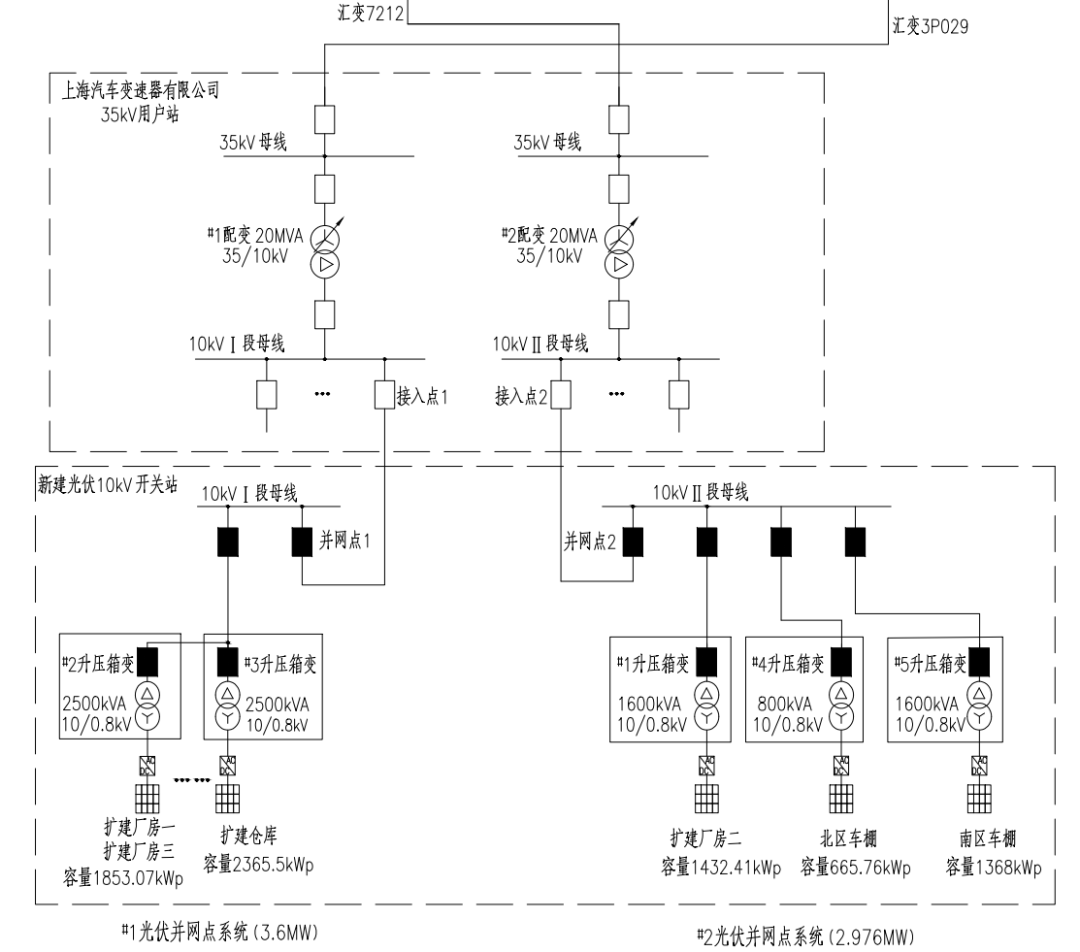 上海汽车变速器有限公司屋顶光伏发电项目(以下简称“本项目”),位于上海市嘉定区,装机容量为8.3MW,采用自发自用余电上网模式。本项目现役35kV用户站1座,站内2台35kV主变,容量均为20MVA。本次光伏设计2个并网点,新建一座10kV开关站,光伏组件逆变为0.8kV交流电压,经升压后2个并网点以10kV电压等级分别接入35kV用户站的10kVⅠ段母线、Ⅱ段母线,并网点容量分别为3.6MW、2.976MW。