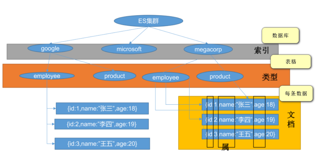具体而言,在特定索引中存储对应的数据类型(Type)中的一个文档(Document),该文档采用JSON格式表示;类似于MySQL中的表结构中存储的内容。