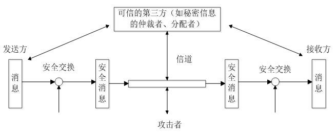网络安全基本模型如图5-4所示。在网络信息传输过程中, 为了确保信息安全, 通常会采用可信中间人技术, 通过加密协议实现数据加密与身份认证, 当出现冲突时能够提供公正调解作用。