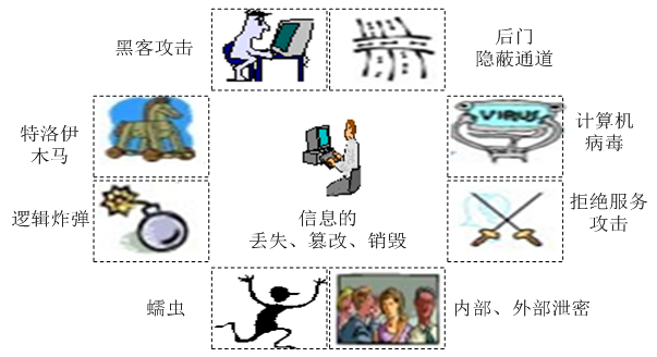 1)[非授权访问];2)[假冒];3)[抵赖];4)[陷门];5)[特洛伊木马];6)[拒绝服务];7)[网络病毒]。