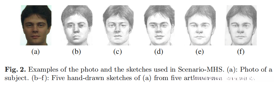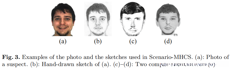 这个场景包括手绘草图和软件生成的复合草图。考虑到画sketches通常花费数年的时间训练一个法医艺术家,而composite generation software只需要几个小时就能合成一张草图。因此,除了法医艺术家之外,执法机构也可以在刑事调查中利用软件工具。