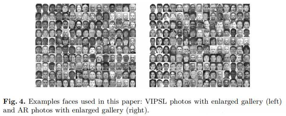前三个数据集中的人脸图像是在类似于VIPSL和AR的相对控制条件下捕获的。增加了来自LFW的受试者,以增加扩大的画廊的多样性。如图4所示,图4(a)和(b)中的左三列人脸是从VIPSL照片和AR照片中选择的,其余的是从放大的画廊中选择的。可以看出,这些照片的质量是相似的,因此扩大的图库会影响性能并帮助呈现更接近真实世界场景的结果