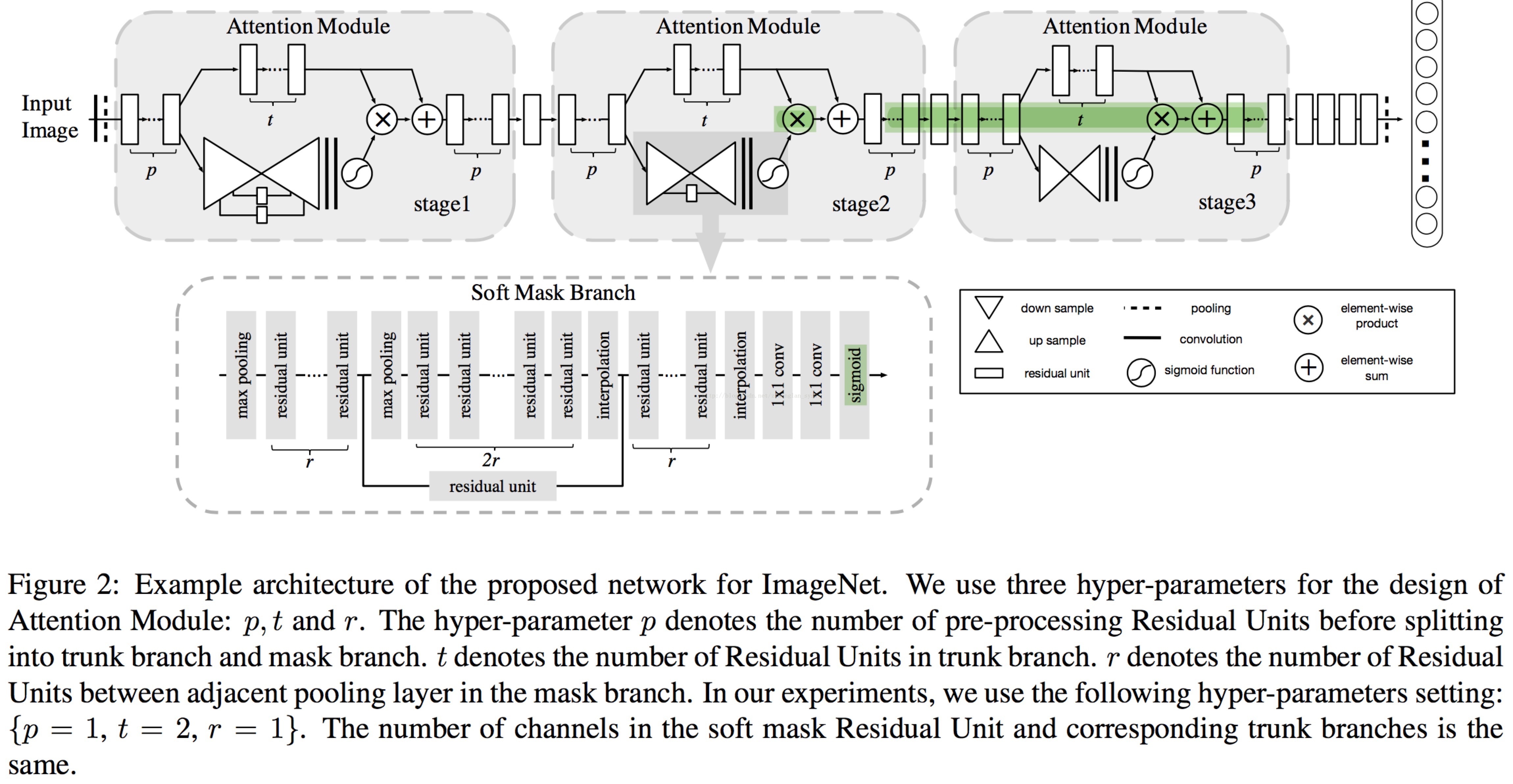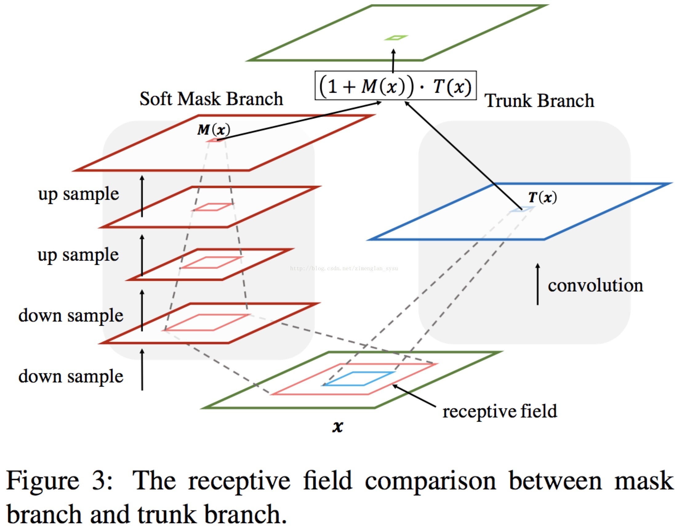 图2是网络架构,其关键点在于hourglass的attention map以及attention和trunck branches的residual connection。具体的细节和公式请看论文,容易理解。下面的图3比较详细地说明了soft mask branch和trunk branch是怎样的子结构。