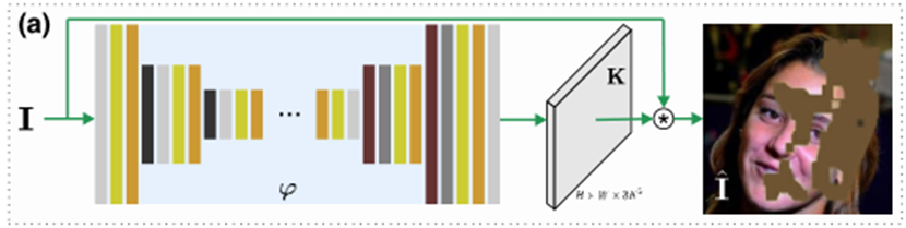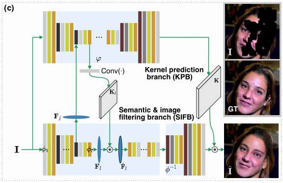 在传统图像修复模型中,预测核模型是一类经典有效的模型(基本思想是一个像素点通过其周围的像素进行线性加权得到新的像素点),并且其不会受到上述问题的困扰。为此作者将预测核引入到深度学习模型中。