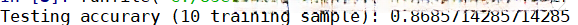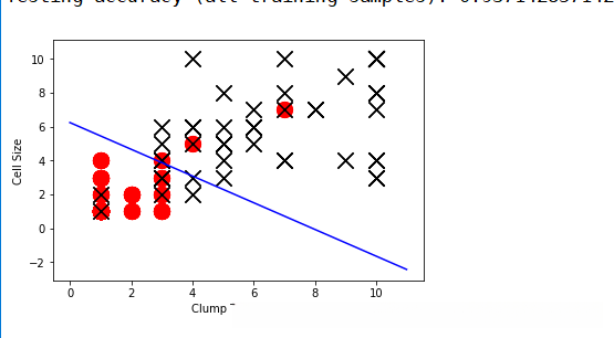print ("Testing accurary (10 training sample):",lr.score(df_test[['Clump Thickness','Cell Size']],df_test['Type']))
