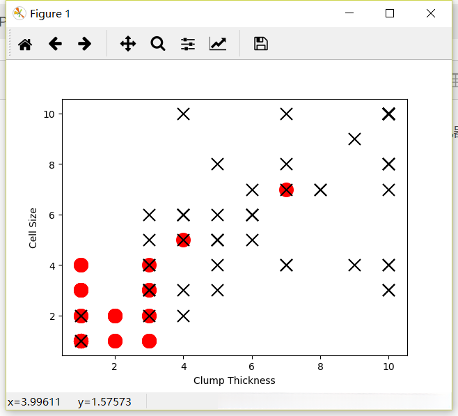 # 选取'Clump Thickness' 与 'Cell Size'作为特征,构建测试集中的正负分类样本。
