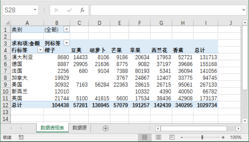 import xlwings as xw   #导入xlwings包import os      #导入os包root = os.getcwd()    #获取当前路径#创建Excel应用,可见,不添加工作簿app=xw.App(visible=True, add_book=False)#打开数据文件,可写bk=app.books.open(fullname=root+r'\创建透视表.xlsx',read_only=False)#获取数据源工作表sht_data=bk.sheets.activerng_data=sht_data.api.Range('A1').CurrentRegion#新建数据透视表所在的工作表sht_pvt=bk.sheets.add()sht_pvt.name='数据透视表'#放透视表的位置rng_pvt=sht_pvt.api.Range('A1')#创建透视表关联的缓冲区pvc=bk.api.PivotCaches().Create(\          SourceType=xw.constants.PivotTableSourceType.xlDatabase,\          SourceData=rng_data)#创建透视表pvt=pvc.CreatePivotTable(\          TableDestination=rng_pvt,\          TableName='透视表')#设置字段pvt.PivotFields('类别').Orientation=\    xw.constants.PivotFieldOrientation.xlPageField    #页字段pvt.PivotFields('类别').Position=1        #页字段中的第1个字段pvt.PivotFields('产品').Orientation=\    xw.constants.PivotFieldOrientation.xlColumnField   #列字段pvt.PivotFields('产品').Position=1        #列字段中的第1个字段pvt.PivotFields('产地').Orientation=\    xw.constants.PivotFieldOrientation.xlRowField    #行字段pvt.PivotFields('产地').Position=1        #行字段中的第1个字段pvt.PivotFields('金额').Orientation=\    xw.constants.PivotFieldOrientation.xlDataField    #值字段