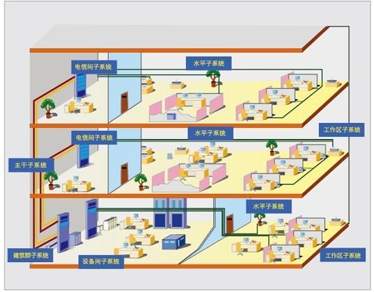 系统划分为三个主要子系统,包括工作区子系统、管理间子系统和设备间子系统,构成二级星型拓扑架构。