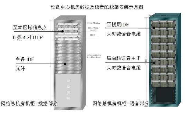 楼层管理区普遍采用19英寸标准机柜作为基础配置,水平配线设备普遍配备模块化配线架,安装在标准机柜上,用于连接水平线缆和网络设备;垂直光纤主干设备普遍采用机架式光纤配线架,安装在标准机柜上,负责连接垂直光纤和网络设备。