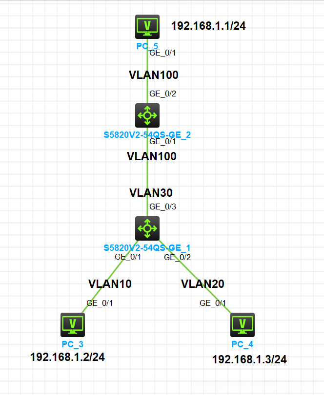 3.SW2 通过 Vlan100 下行连接 SW1,要求 PC3 和 PC4 都能以 Vlan100 访问 PC5