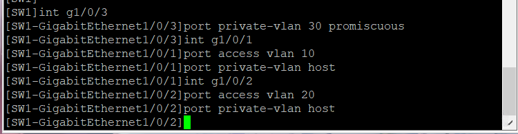 - 在SW1上创建并配置Primary VLAN(Vlan30)与Secondary VLAN(Vlan10和Vlan20),确保Secondary VLAN对上行设备不可见。