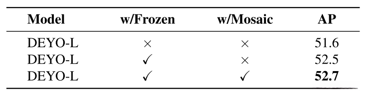 在表8中,我们分析了通过在训练的第二阶段期间冻结DEYO的主干和颈部从根本上解决早期二分图匹配的不稳定性而产生的增强,这积极地改善了早期二分图匹配的稳定性。这积极地影响了网络性能。与在整个第二阶段微调骨干和颈部相比,冻结的行为使DEYO的性能提高了1.1 AP。此外,由于DEYO的第一阶段涉及对COCO [16]数据集进行对象检测任务的预训练,因此它允许在训练的第二阶段实施更强大的数据增强策略。因此,与DETR不同,采用Mosaic数据增强不会导致性能下降;相反,它有助于0.2 AP的改进。