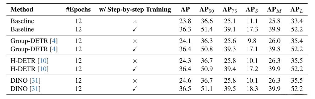 表6中给出的实验结果阐明了当不采用逐步训练策略时,DINO[31],H-DETR[10]和Group-DETR[4]的性能明显下降,与我们的方法形成鲜明对比。与我们的方法相比,参考文献[4,10,31]中提出的方法未能有效地应对由于缺乏监督信号而引发的培训挑战,同时最终导致培训支出膨胀。相反,如表9所示,我们的训练方案不仅避免了额外的训练开销,而且还大大减少了检测器的训练费用(Group-DETR所需的3300个查询可能会使训练持续时间增加六倍)。DEYO模型训练的初始阶段只需要16 GB的VRAM,而随后的阶段需要更少,8 GB的VRAM。对于培训资源受限的场景,DEYO可以停用CDN功能,以进一步降低VRAM要求。如表6所示,渐进式培训策略在第一阶段为DEYO提供了高质量的预培训基础,确保即使CDN停用,性能改进仍然是可管理的。