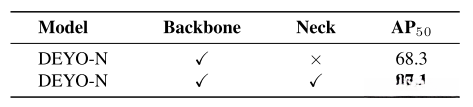 在表7中,我们检查了Neck组件提供的高质量多尺度特征的重要性,这些特征在DEYO模型的第一阶段进行了预训练。该模型的性能显着下降了18.8平均精度点,仅达到68.3平均精度,当单独使用预先训练的骨干,而没有预先训练的颈部逐步训练。这些发现清楚地表明,DEYO模型上级性能的关键不在于使用ImageNet之外的更复杂的预训练骨干,而在于第一阶段预训练的Neck,它用高质量的多尺度特征来描述模型。
