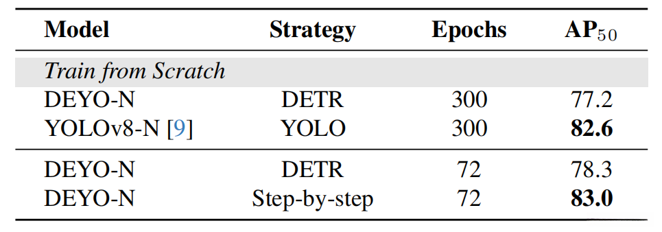 表6.DEYO-N 12-Epoch训练设置下不同方法的比较。与我们的方法相比,以前的方法不能有效地解决监督信号不足所带来的培训挑战,这也导致了额外的培训成本。