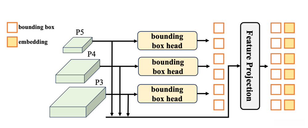 图3.我们将边界框的生成与嵌入分离,通过增强的特征投影,可以更有效地压缩颈部发出的多尺度信息。