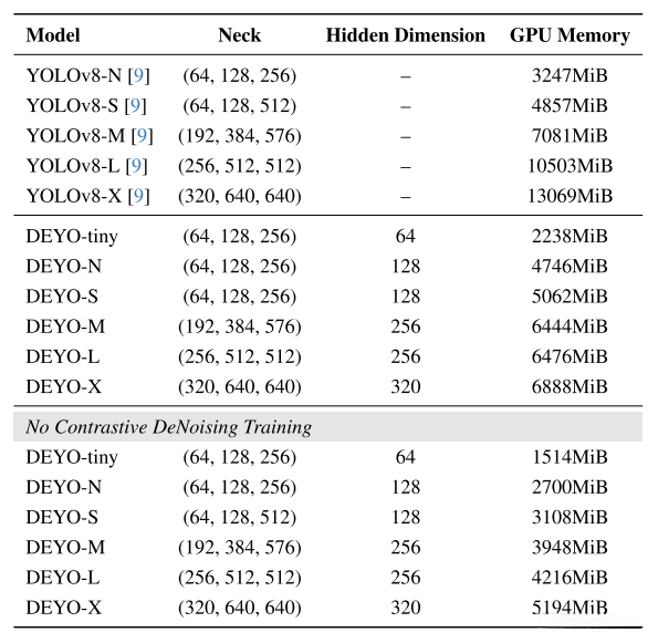 表9.YOLO和DEYO的详细配置以及GPU内存使用情况。