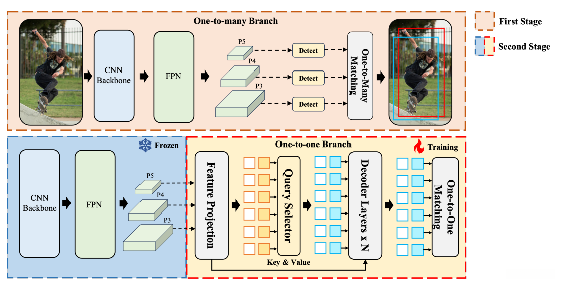 如图所示,DEYO的一对一分支采用类似于DINO的架构,利用Transformer的自我注意机制来捕获查询间的关系,从而建立抑制冗余边界框的分数差异。在Transformer解码器的每一层中,查询被逐步细化,最终得到与对象一一对应的预测。这种设计大大简化了DEYO中的对象检测过程,消除了对非最大抑制(NMS)的依赖,确保了一致的推理速度。在DEYO训练的第二阶段,我们冻结了DEYO的骨干和颈部,以从根本上规避训练初始阶段的二分匹配不稳定性,否则可能会对预训练的骨干造成不良影响。受益于第一阶段提供的高质量初始化,DEYO实现了快速收敛和卓越的性能,即使在一对一分支中只监督几百个查询并从头开始训练。