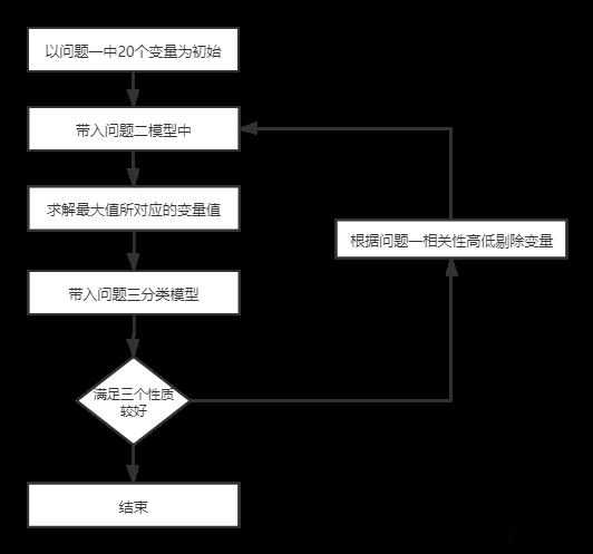 此时就能找到能够使生物活性达到最大值时上述分子描述符的取值,然后将上述初值带入到问题三构建的分类模型中,看看ADMET分别取值是多少,若有三个性质较好则表示已经完成,若效果并不好,则返回第一步按照问题一中相关性高低原则逐渐剔除因子,指导既满足分子活性最大又使得ADMET中至少三个性质较好。