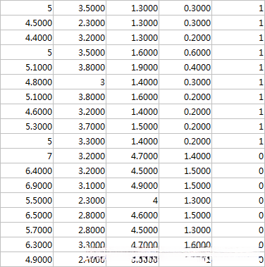 分类案例:本文使用的例子是安德森鸢尾花卉数据集(iris),这个数据集中包含150个样本,对应着它的150行,每一行包含这个样本的4个特征(花萼长度、花萼宽度、花瓣长度、花瓣宽度)和样本的类别标签(0或1或2,它们分别代表不同的品种),所以数据集中存储的是一个尺寸为150×5的二维矩阵(数据集中部分样本的信息如下图所示)。由于我们此次只研究二分类问题,所以我们只选用数据集的前100个样本,即类别标签为“0”或“1”的样本。我们的任务是:建立一个逻辑回归分类器,这个分类器可以通过样本的4个特征值来预测样本的标签是“0”还是“1”。