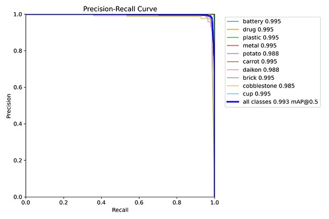 Tipps:为了收集不同分类的垃圾分类相关图像,并借助Labelimg标注工具对每张图片进行标注。将这些图像划分为10个检测类别,“电池", “药物", “塑料", “金属", “土豆", “胡萝卜", “白萝卜", "砖块"以及"鹅卵石"等物品会被单独识别出来。