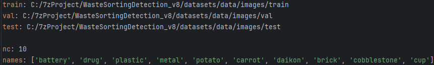 该文件指定了用于模型训练与验证的数据集路径,并包含了模型将要识别的目标分类类别。