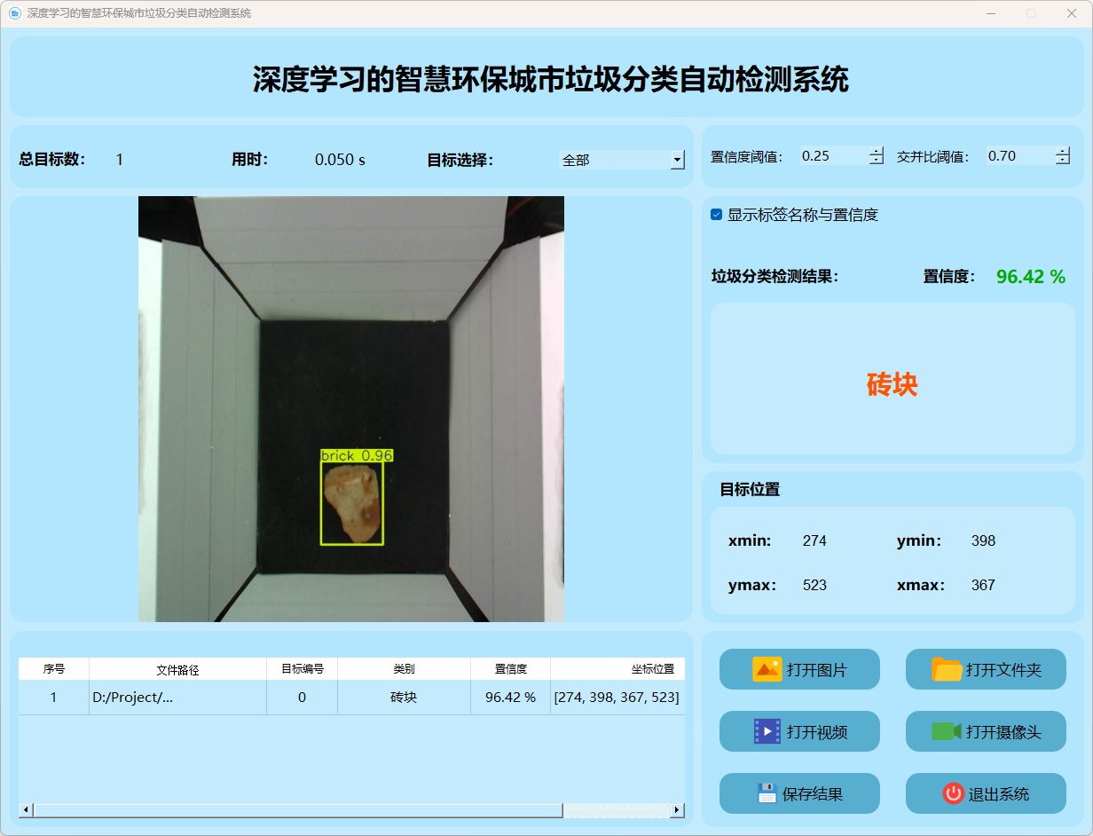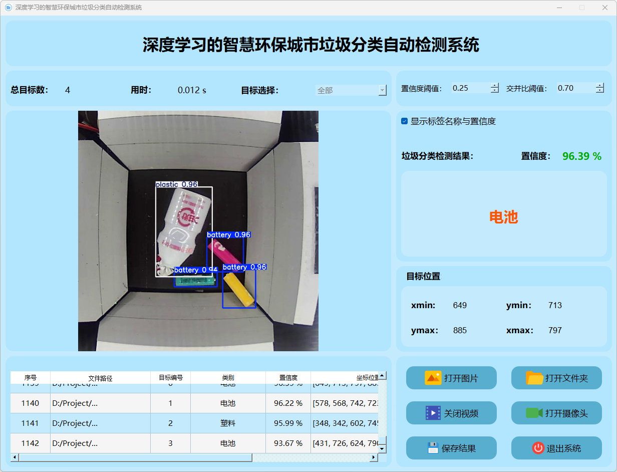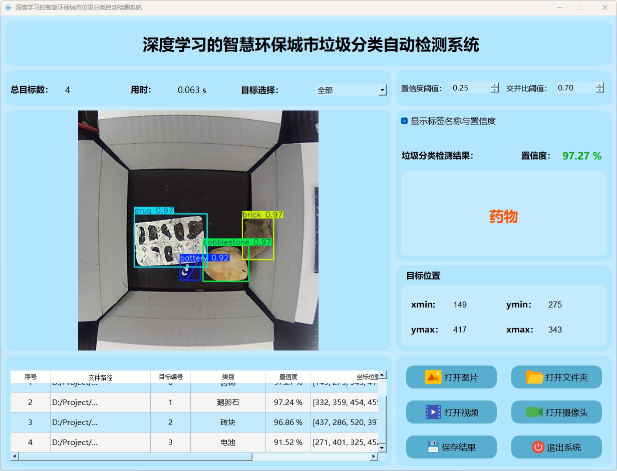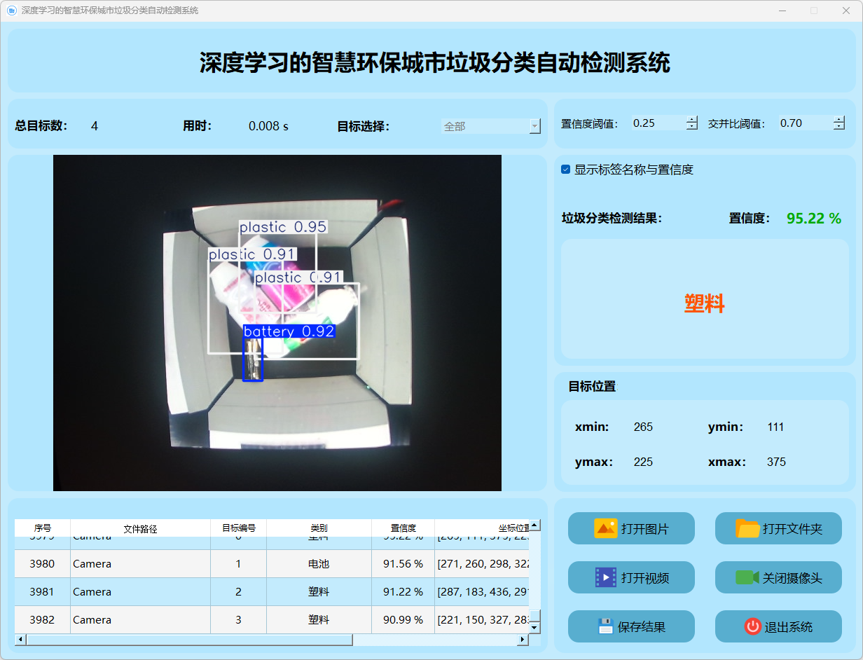 主要功能:该系统具备完成目标图像中垃圾分类识别的能力;它不仅能够对图像、视频以及摄像头获取的画面进行分类识别,还可以处理多幅图像的一次性分析;系统界面会实时呈现目标定位坐标数据(如x,y坐标)、总物体数量统计以及每件物品的置信度评分和所需时间;该系统能够将分析结果存储为图像标注文件或视频分段报告格式。