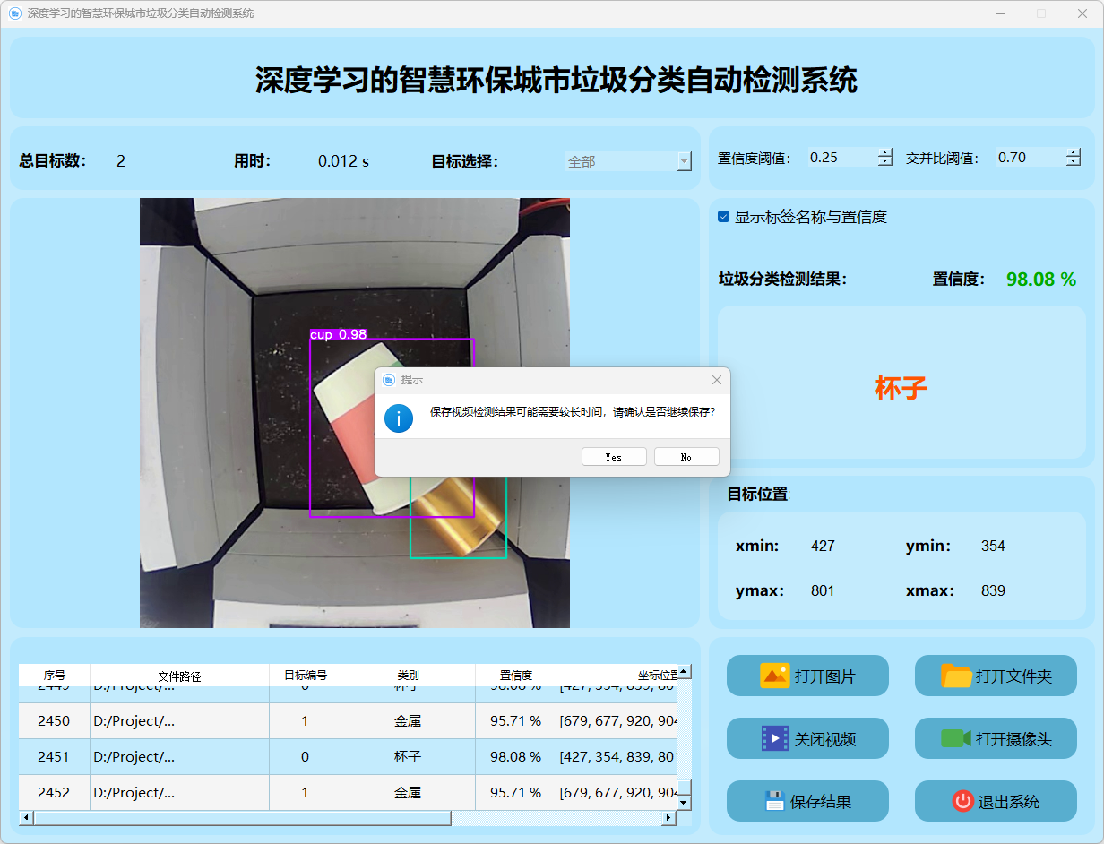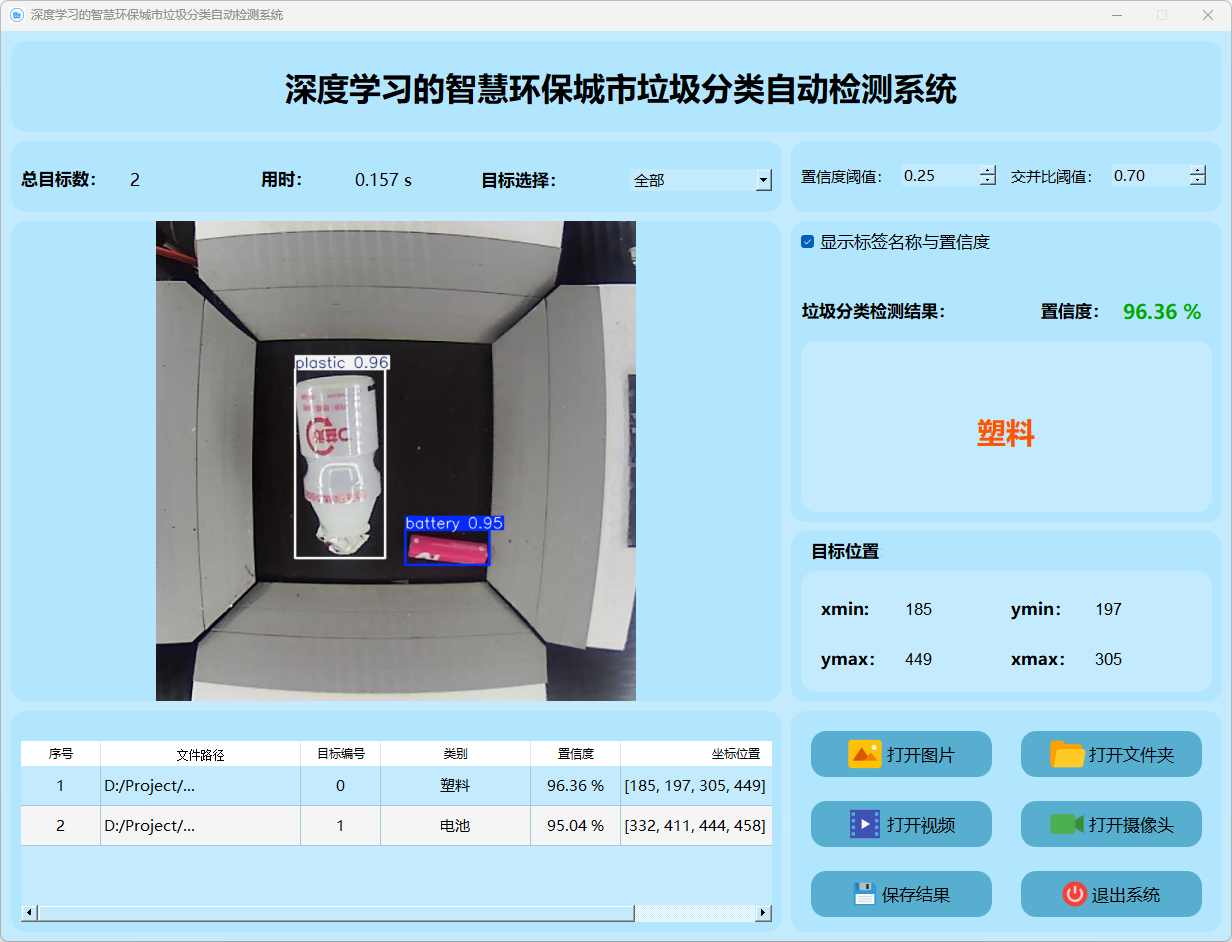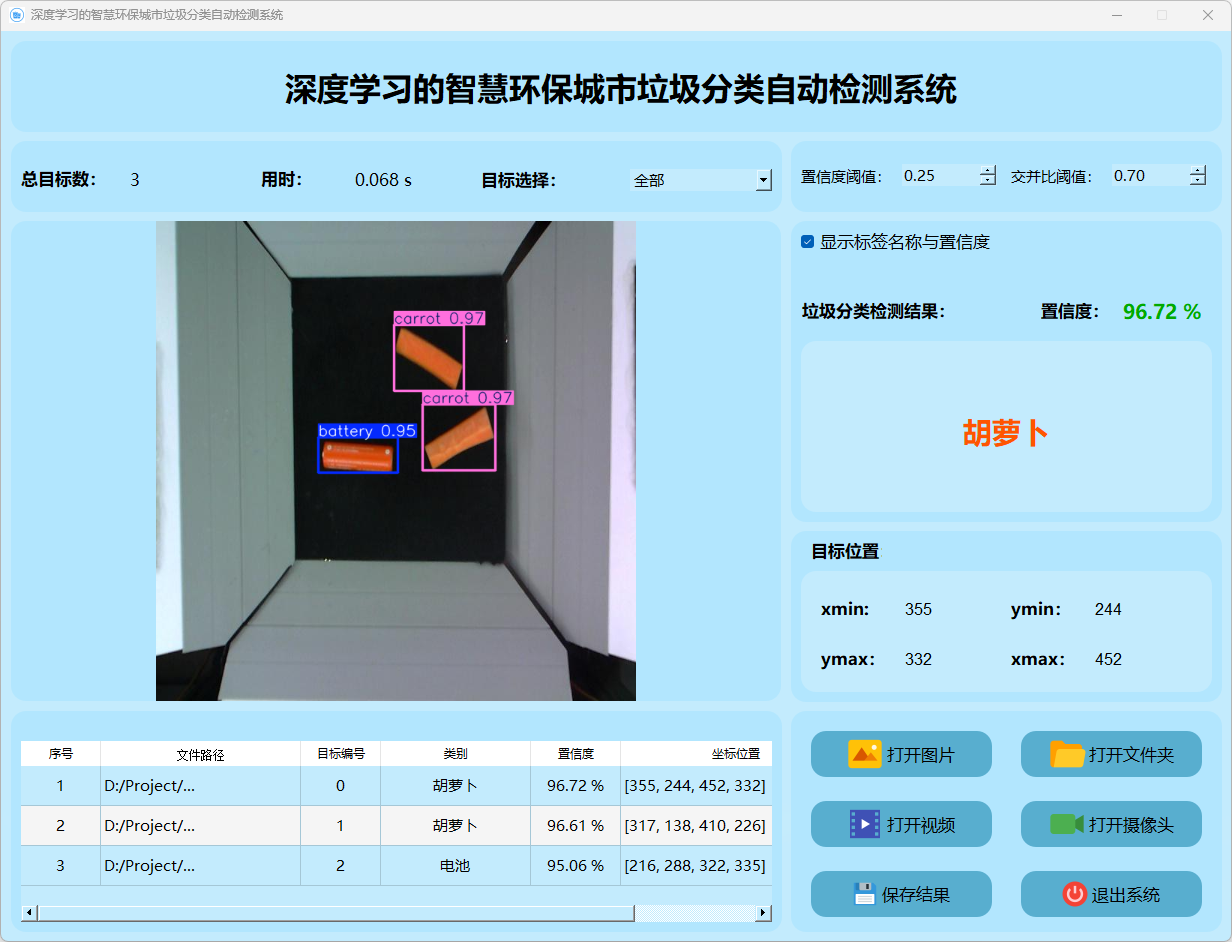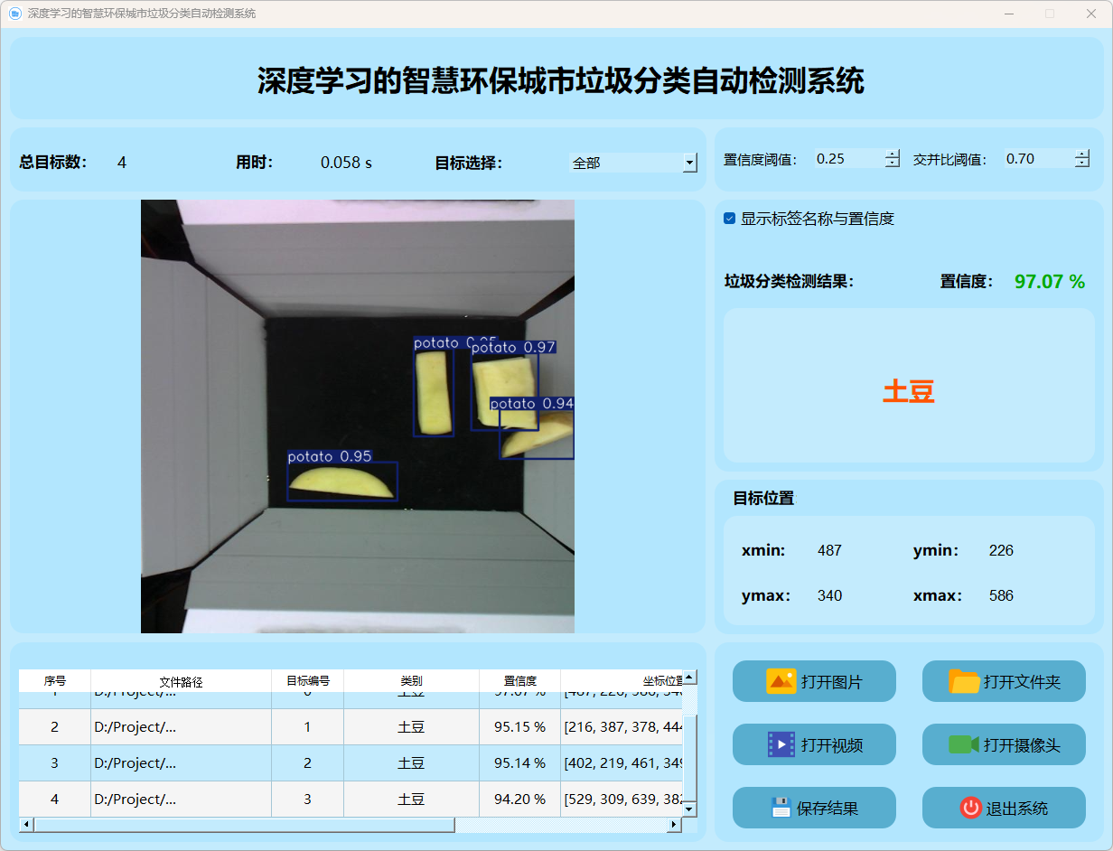 主要功能:该系统具备完成目标图像中垃圾分类识别的能力;它不仅能够对图像、视频以及摄像头获取的画面进行分类识别,还可以处理多幅图像的一次性分析;系统界面会实时呈现目标定位坐标数据(如x,y坐标)、总物体数量统计以及每件物品的置信度评分和所需时间;该系统能够将分析结果存储为图像标注文件或视频分段报告格式。