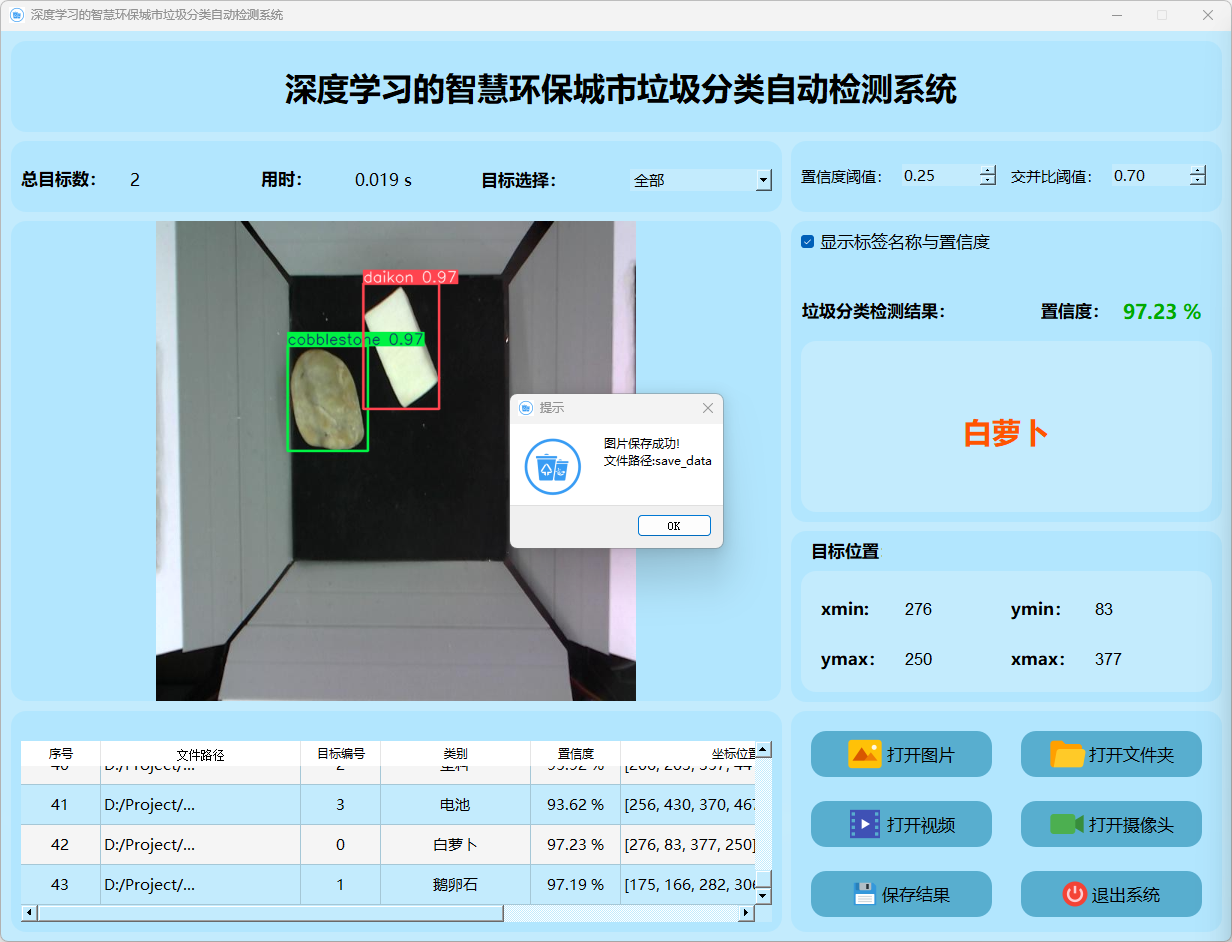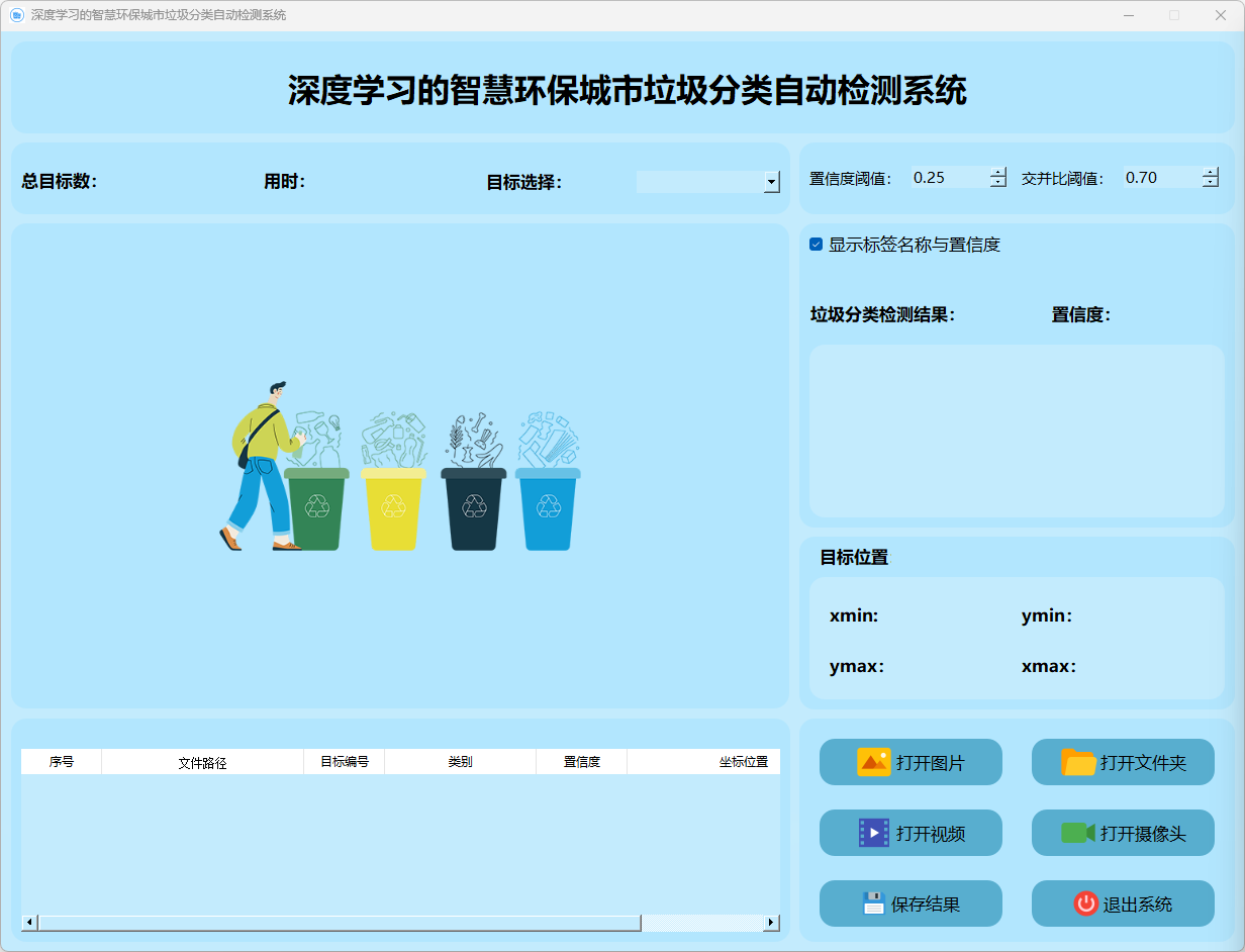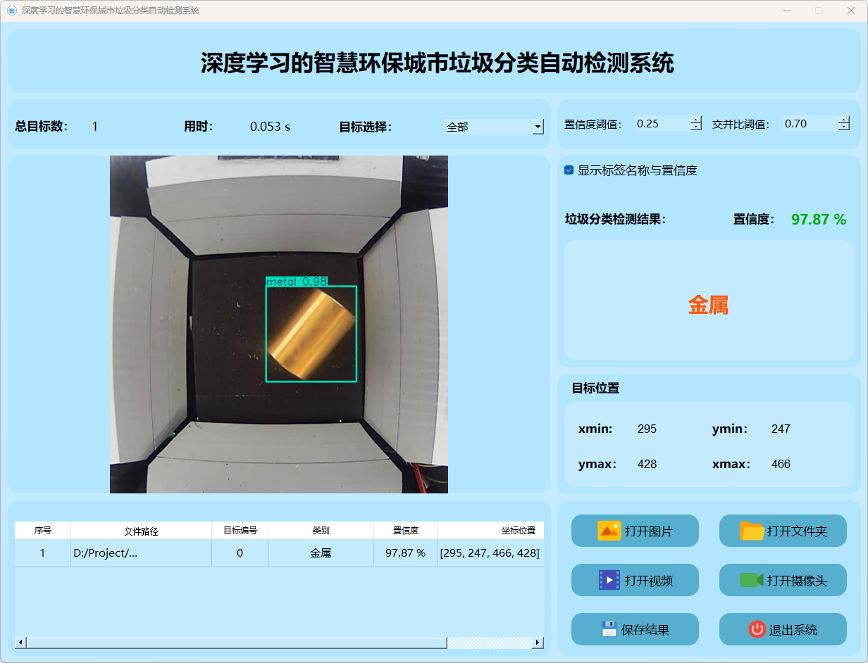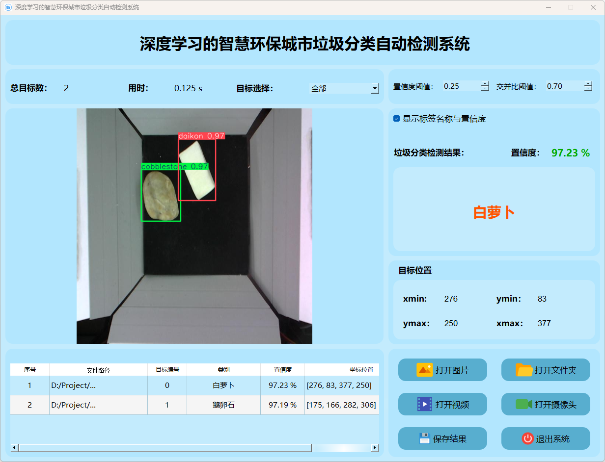 主要功能:该系统具备完成目标图像中垃圾分类识别的能力;它不仅能够对图像、视频以及摄像头获取的画面进行分类识别,还可以处理多幅图像的一次性分析;系统界面会实时呈现目标定位坐标数据(如x,y坐标)、总物体数量统计以及每件物品的置信度评分和所需时间;该系统能够将分析结果存储为图像标注文件或视频分段报告格式。