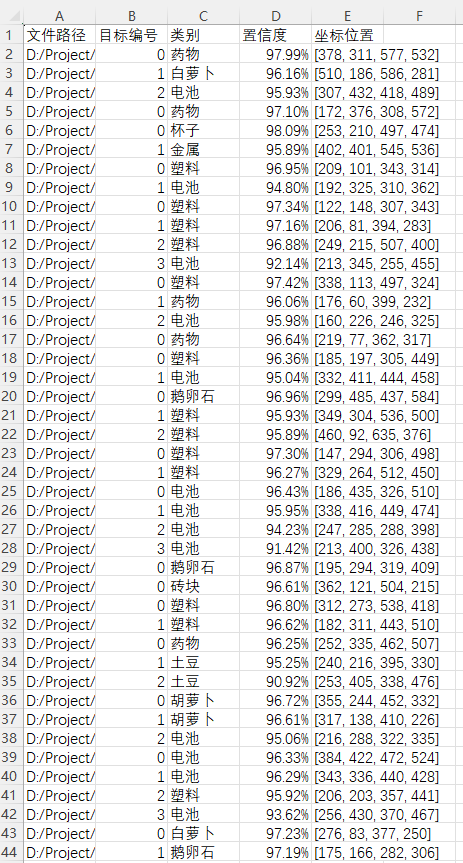 在所使用的csv文件中包含以下详细信息:图片路径、目标标记编号、目标分类标签、检测置信度评分以及目标定位坐标的详细信息。具体来说,在该数据集中记录了每个目标的位置信息:其坐标位置参数表示为检测框左上角与右下角两个顶点的x轴和y轴坐标值。