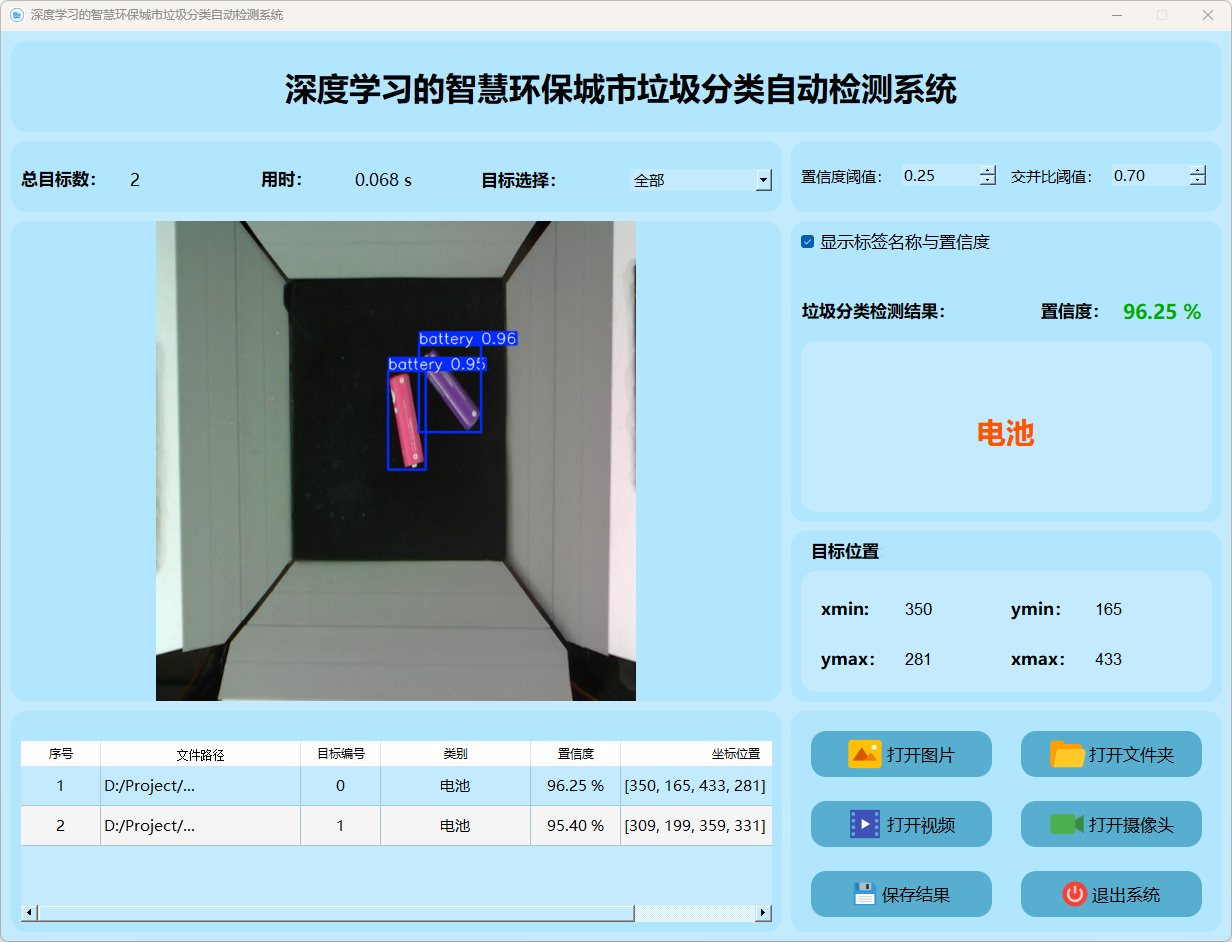 该界面不仅展示了系统的视频帧多目标检测性能,并且能够精确识别垃圾分类图像的目标;同时提供详细的结果信息和分类置信度分数。
