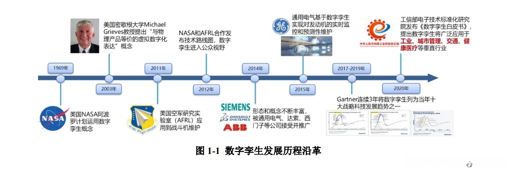 数字孪生的概念始于航天军工领域,经历了“技术探索、概念提出、应用萌芽、行业渗透”四个发展阶段。数字孪生技术最早在 1969 年被 NASA 应用于阿波罗计划中,用于构建航天飞行器的孪生体,反映航天器在轨工作状态,辅助紧急事件的处置。2003 年,数字孪生概念正式被密歇根大学的 Grieves 教授提出,并强调全生命周期交互映射的特征。经历了几年的概念演进发展后,自 2010 年开始,数字孪生技术在各行业呈现应用价值,美国军方基于数字孪生实现 F35 战机的数字伴飞,降低战机维护成本和使用风险;通用电器为客机航空发动机建立孪生模型,实现实时监控和预测性维护;欧洲工控巨头西门子、达索、ABB 在工业装备企业中推广数字孪生技术,进一步促进了技术向工业领域的推广。近年来,数字孪生技术在工业、城市管理领域持续渗透,并向交通、健康医疗等垂直行业拓展,实现机理描述、异常诊断、风险预测、决策辅助等应用价值,有望在未来成为经济社会产业数字化转型的通用技术。