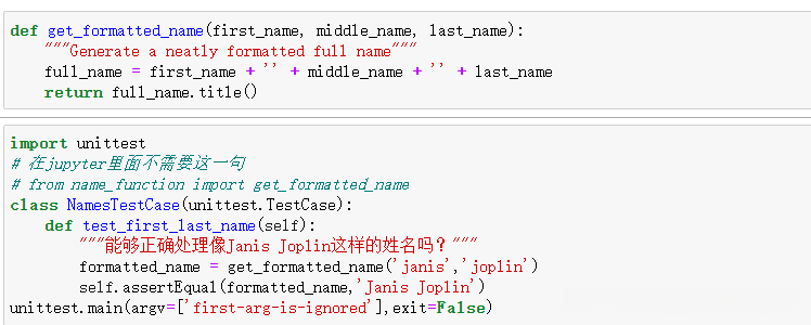 你可以随便给这个类命名,但最好让它看起来与要测试的函数相关,并包含字样Test。这个类必须继承unittest.TestCase类,这样python才知道如何运行你编写的测试。