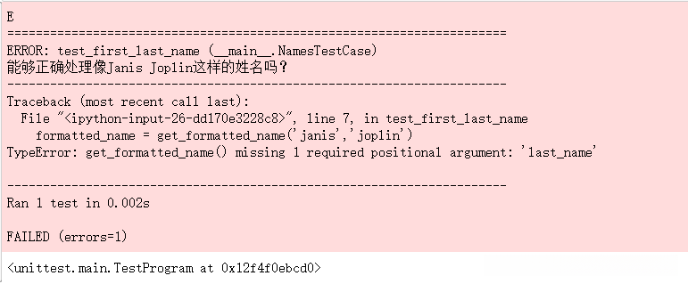 运行测试用例时,每完成一个单元测试,python都打印一个字符:测试通过时打印一个句点;测试引发错误时打印一个E;测试导致断言失败时打印一个F。如果测试用例包含很多单元测试,需要运行很长时间,就可通过观察这些结果来获悉有多少个测试通过了。