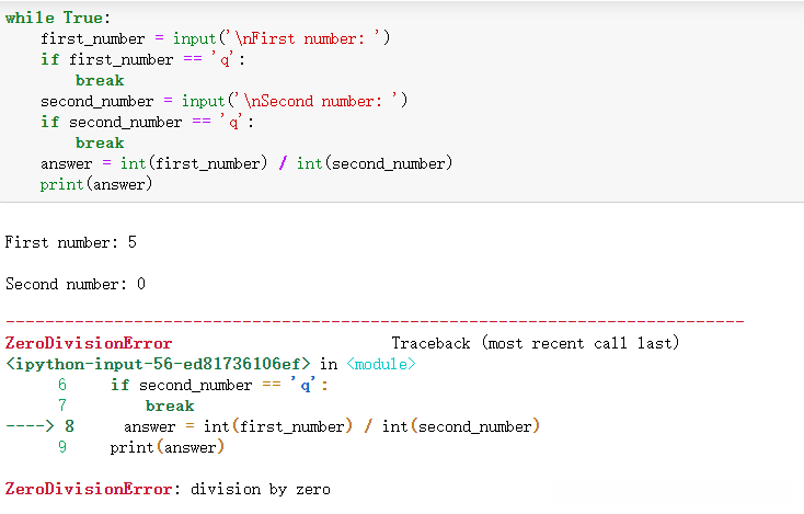 如果try代码块中的代码运行起来没有问题,python将跳过except代码块;如果try代码块中的代码导致了错误,python将查找这样的except代码块,并运行其中的代码,即其中指定的错误与引发的错误相同。