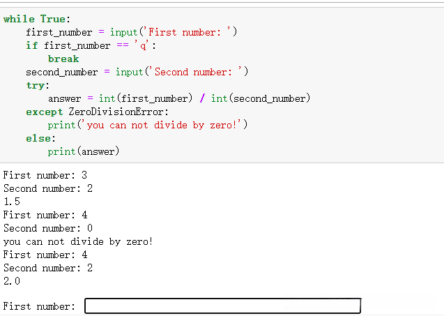 通过将可能引发错误的代码放在try--except代码块中,可提高这个程序抵御错误的能力。依赖于try代码块成功执行的代码都应放到else代码块中。在这个例子中,如果除法运算成功,我们就使用else代码块来打印结果。