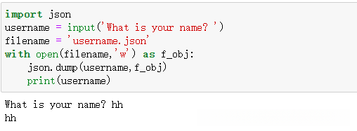 我们提示输入用户名,并将其存储在一个变量中。调用json.dump(),将用户名存储到文件中。