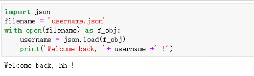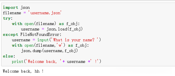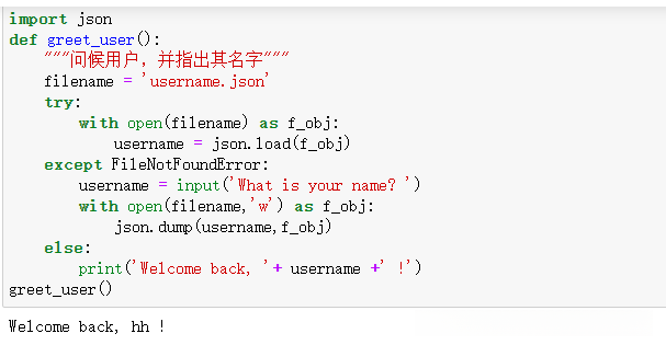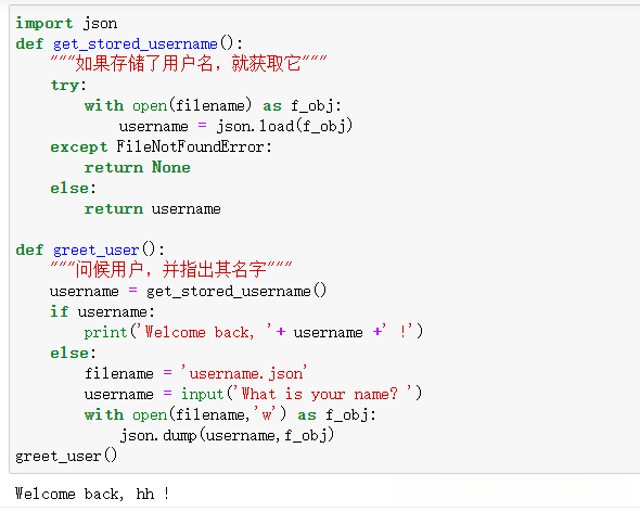 新增的函数get_stored_username()目标明确,如果存储了用户名,这个函数就获取并返回它;如果文件username.json不存在,这个函数就返回None。这是一种不错的做法:函数要么返回预期的值,要么返回None;这让我们能够使用函数的返回值做简单测试。