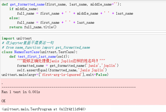 下面是只包含一个方法的测试用例 test_name_function.py,它检查函数get_formatted_name()在给定名和姓时能否正确的工作: