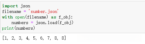 函数 json.dump() 接受两个实参:要存储的数据以及可用于存储数据的文件对象。通常使用文件扩展名.json来指出文件存储的数据为JSON格式。这个程序没有输出,我们可以打开文件number.json,看看其内容。