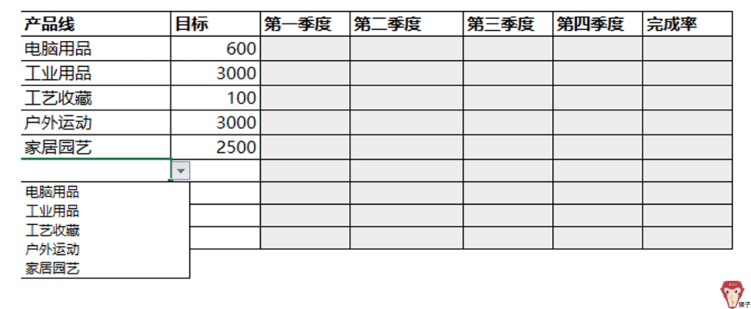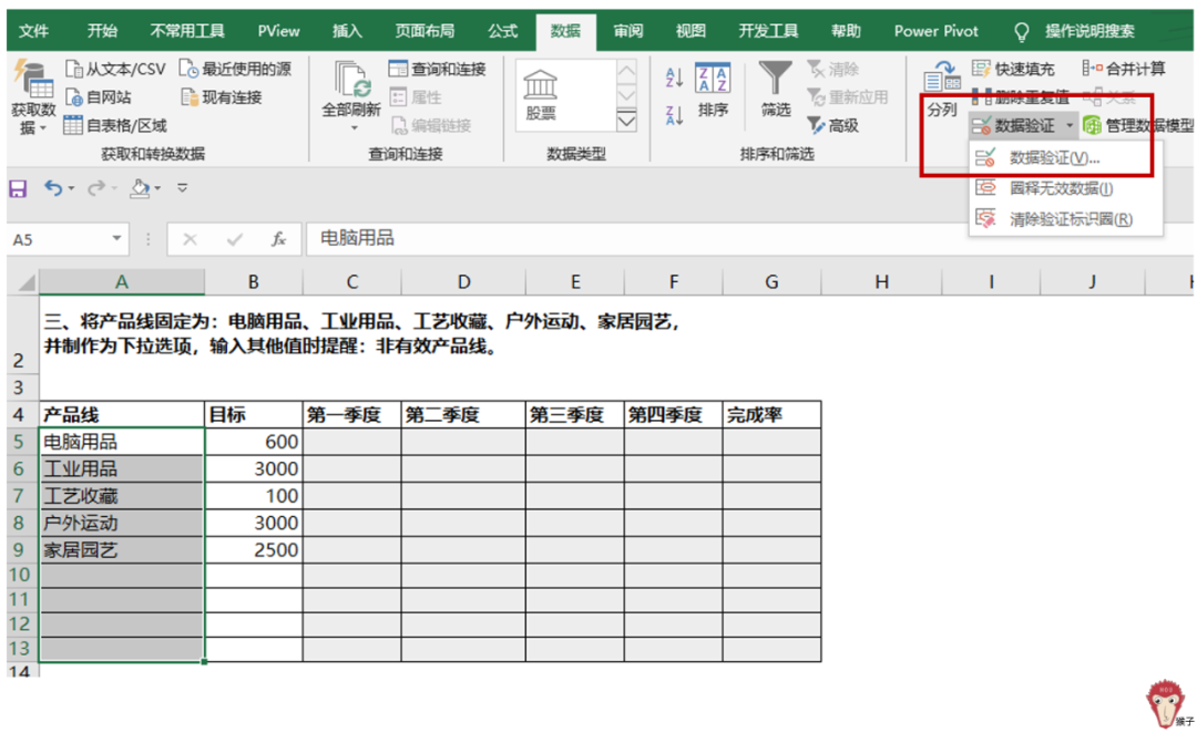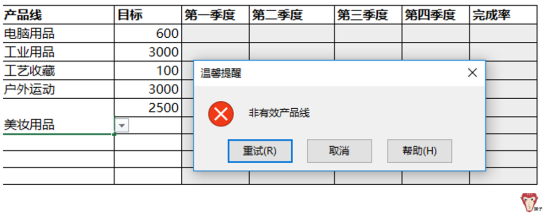 问题3:设置产品线为电脑用品、工业用品、工艺收藏、户外运动及家居园艺,并将其设置为下拉选项;当输入其他值时会提示:无效的产品线。