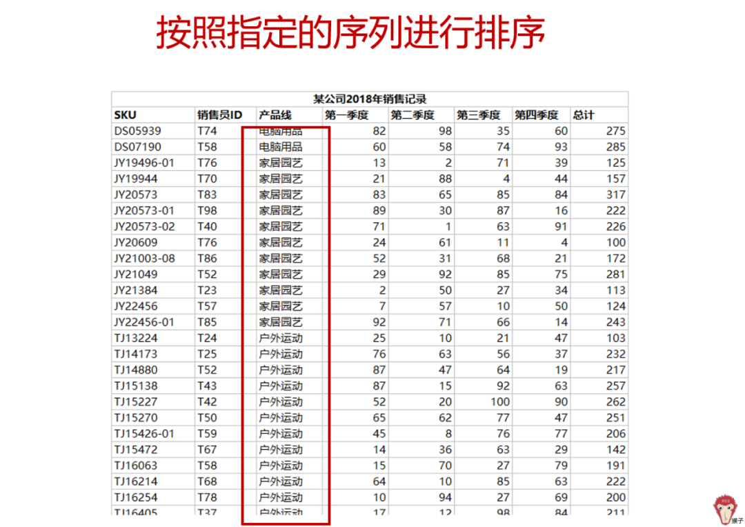 在实际工作中,常见的排序需求往往超越了简单的升序或降序要求,在某些情况下需要更为复杂的排列方式以满足特定需求。例如,在对“产品线”中的各项产品进行排列时(如电脑用品-家居园艺-户外运动-工业用品-工艺收藏),通常会调用或使用“自定义排序功能”来实现所需排列顺序。