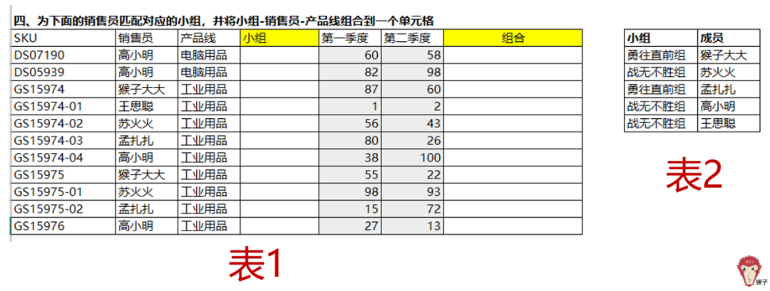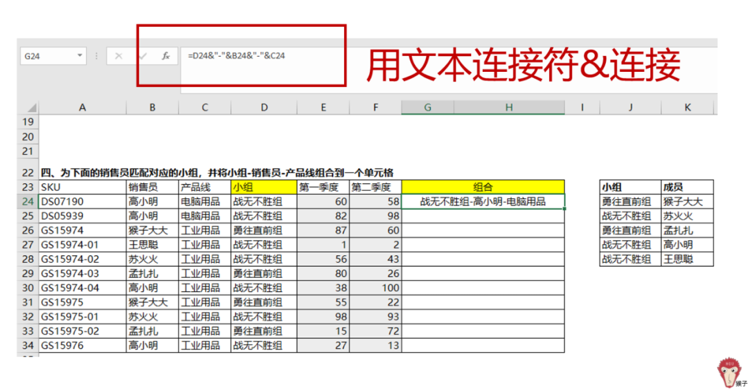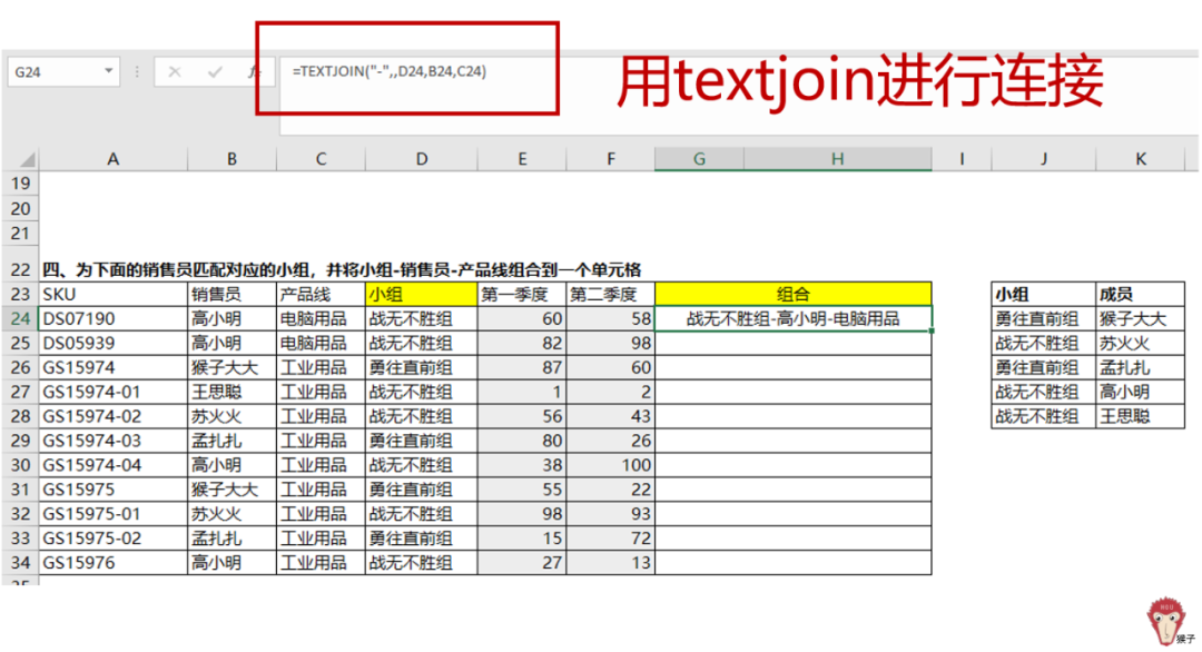 问题4:将销售员与相应的小组配对,并将小组、销售员及产品线整合到同一个单元格内