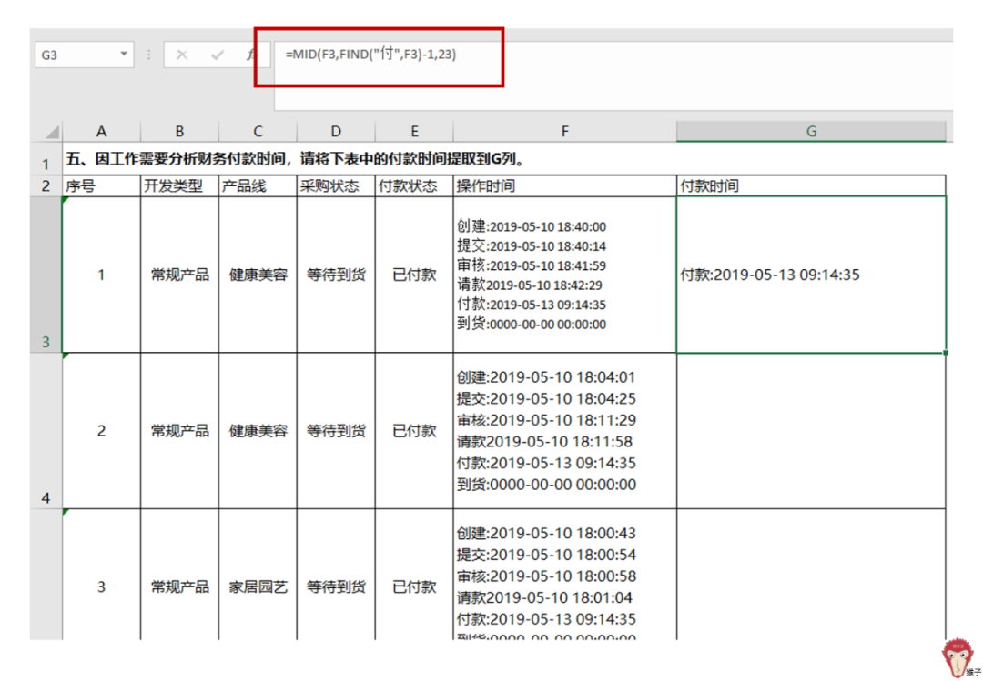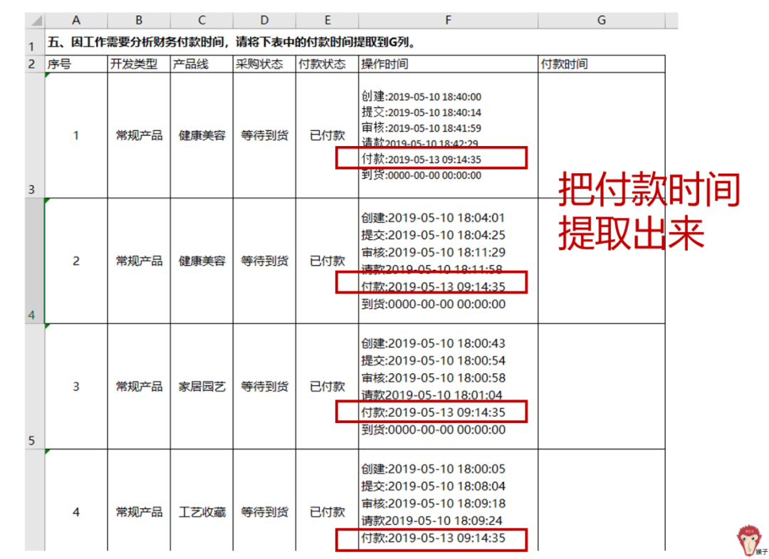 问题5:因工作需要分析财务付款时间,请将下表中的付款时间提取出来