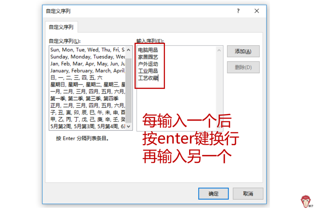 在“自定义序列”设置界面中进行操作时,请按照所需的顺序依次输入各项内容,在每次输入完成后按下Enter键以换行,并确保每次操作均已完成后再进行下一步骤以便继续添加后续内容。