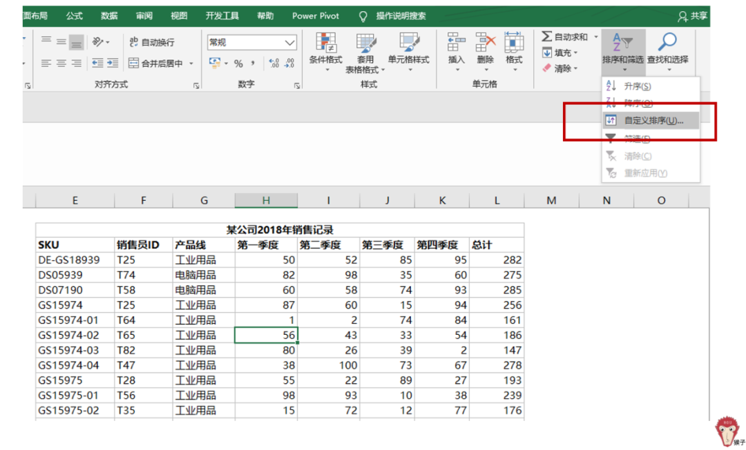 单击销售记录表内任一单元格-【排序和筛选】-【自定义排序】