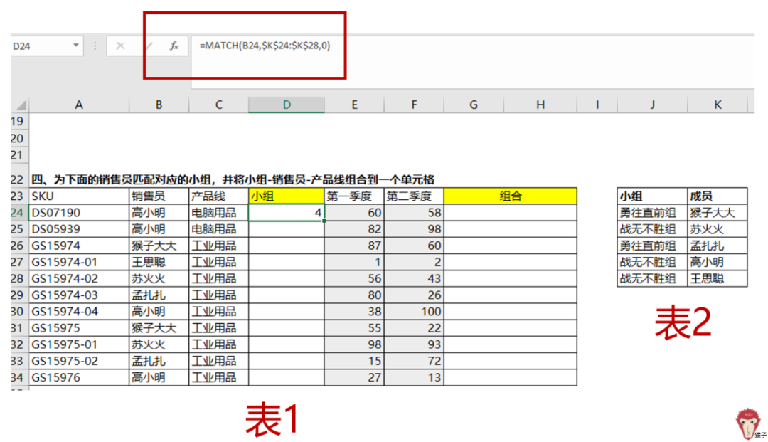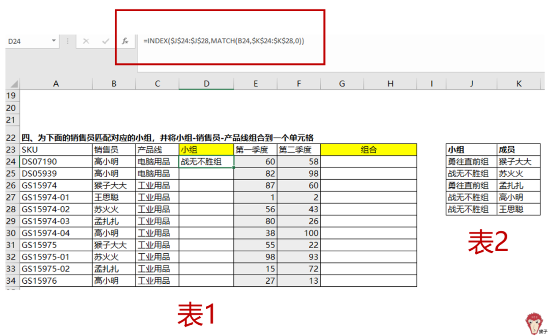 在区域J列2至J列8(即表2中的'小组'这一列)内执行查找引用操作,并确定该数值的位置。具体来说,在区域J_{2}至J_{8}内寻找对应的数值位置。例如,在之前的步骤中使用match函数确定了高小明位于第四行的位置。因此,请查看该位置上的'战无不胜组'这一单元格中的内容即可完成查找操作。通过向下填充公式,则可获取所有销售人员对应的组别信息。