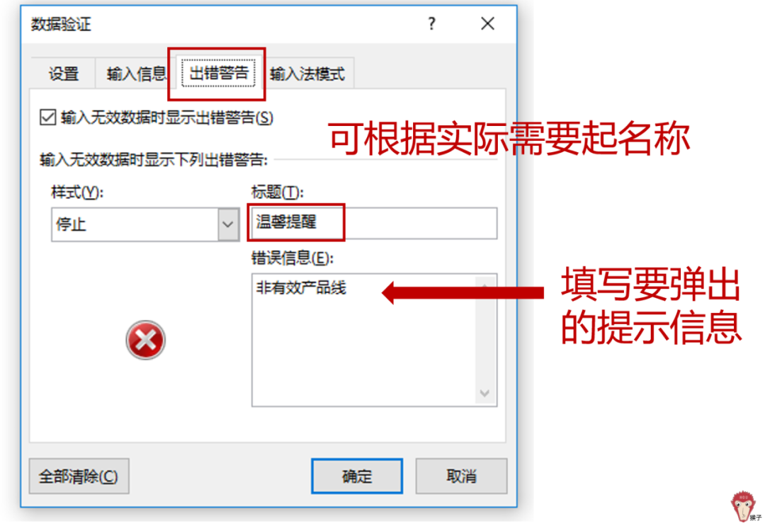 - 在"错误信息"字段中输入当输入无效值时自动生成相应的提示信息。
