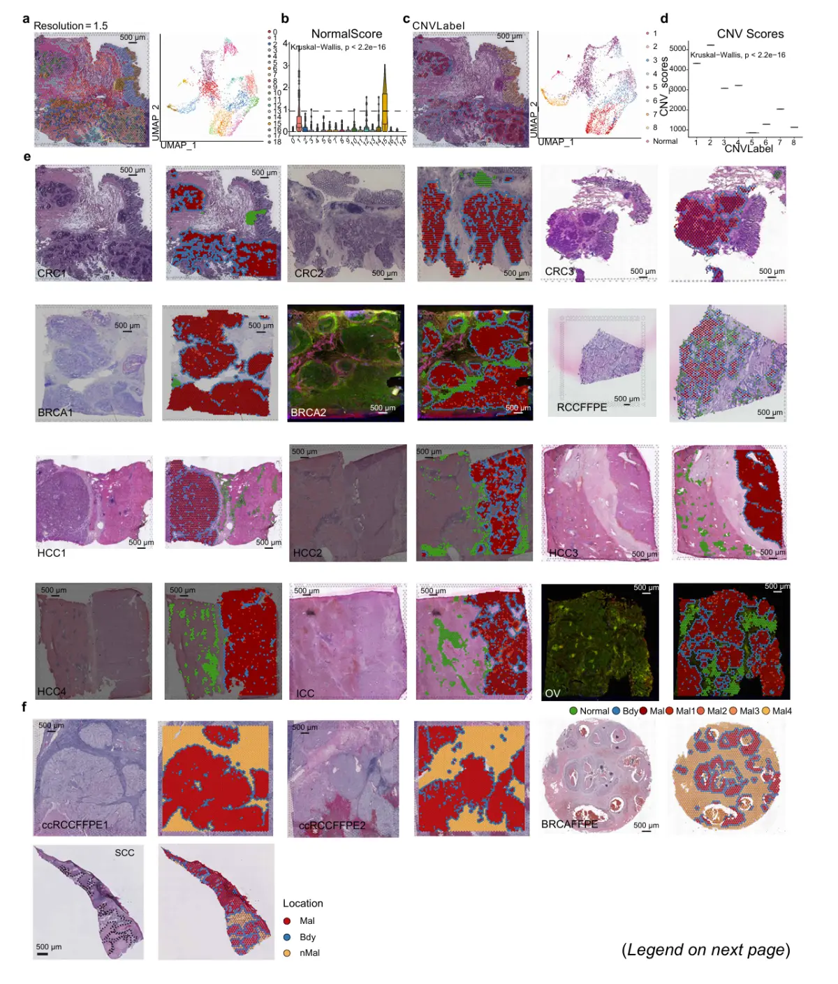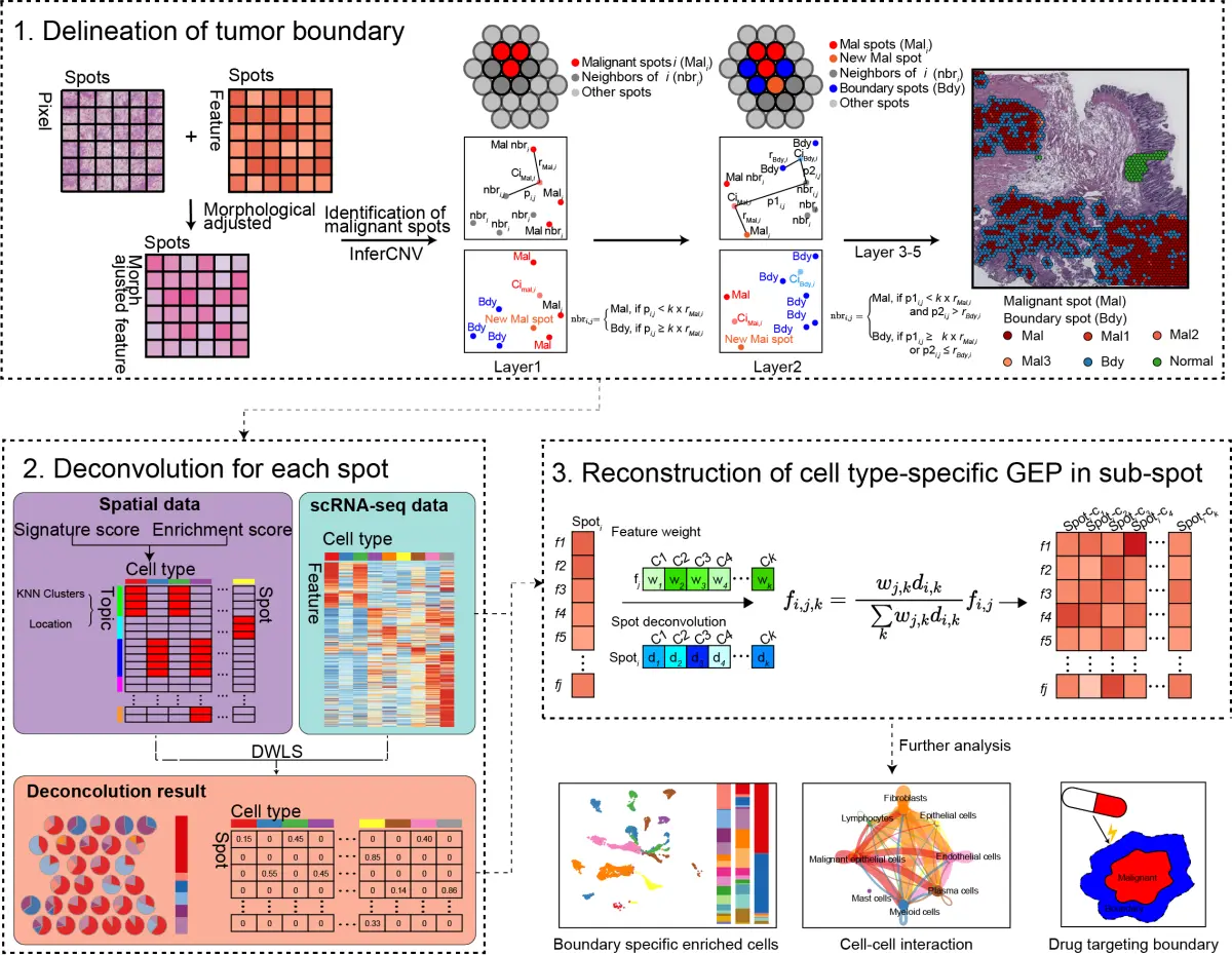 肿瘤微环境(TME)由多种常驻或浸润性宿主细胞(如恶性细胞、免疫细胞及基质细胞)与非细胞成分(如分泌因子、细胞外基质蛋白)构成,并对肿瘤的发生、进展及转移产生重要影响;同时这些因素与免疫检查点阻断(ICB)治疗反应密切相关。然而由于位置与组织的不同,TME其细胞组成及细胞间相互作用也会有所差异。肿瘤边界是一个位于实体瘤最外围的恶性细胞与非恶性细胞形成的生态位区域,在空间布局上彼此紧密相连,从而将这些不同的空间区域有机地连接在一起 。尽管细胞组成、细胞间相互作用及肿瘤边界的分子网络调控均对TME重塑具有深远影响,但目前对于肿瘤边界的定义仍然存在较大争议:它通常仅基于免疫组化(IHC)染色数据进行主观描述,而缺乏统一的标准或系统的方法来进行划分。目前还没有有效的实验手段或生物信息学工具来系统地划定肿瘤边界。以遗传变异和拷贝数变异(CNVs)为特征的肿瘤异质性;通过基于ST转录组数据计算不同区域的CNV评分能够有效反映恶性细胞的比例,从而有助于确定核心肿瘤区域 。